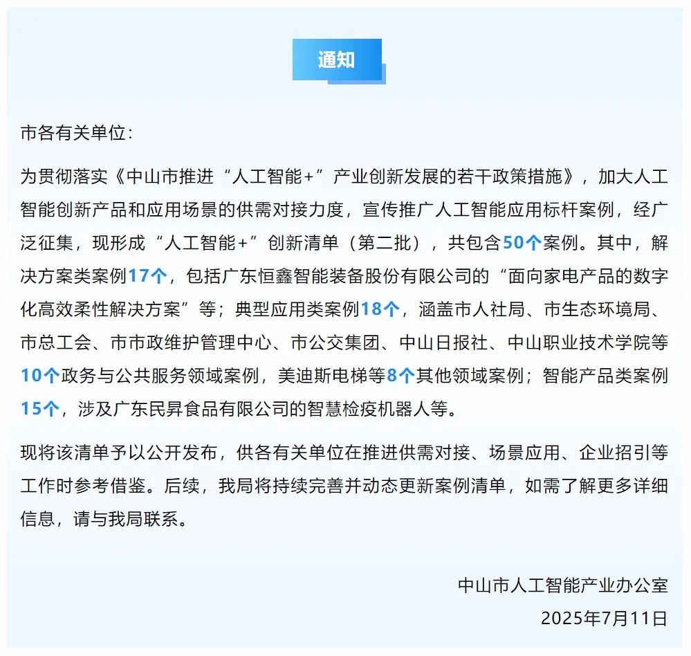 据悉,为贯彻落实《中山市推进“人工智能+”产业创新发展的若干政策措施》,加大人工智能创新产品和应用场景的供需对接力度,宣传推广人工智能应用标杆案例,中山市在经过广泛征集后,形成了“人工智能+”创新清单(第二批),其中解决方案类案例17个,典型应用类案例18个,智能产品类案例15个。该清单可供各有关单位在推进供需对接、场景应用、企业招引等工作时参考借鉴。